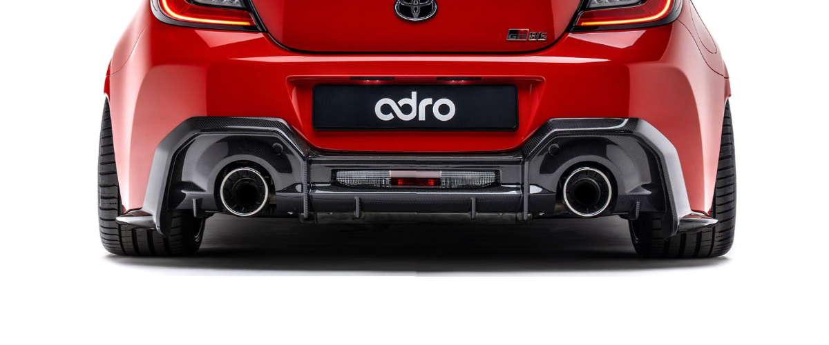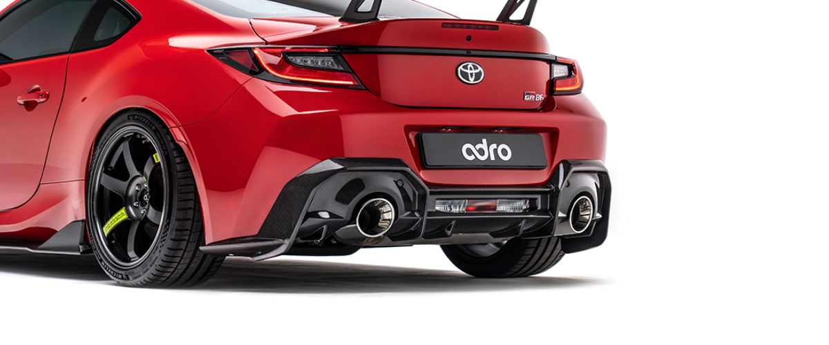 adro(エイドロ)製、トヨタGR86&スバルBRZ2genエアロプログラムは、元ウイリアムズF1の空力学者スコット氏のデザインによる優れたエアロダイナミズムを実装した製品です。ストックボディ(ノーマル幅)用GR86とBRZ2gen各専用カーボンフロントリップスポイラー&カーボンサイドスポイラー&カーボンリアディフューザー&ドライカーボンスワンネックウイング(フロントリップスポイラー以外はGR86とBRZ2gen共用)をラインナップ致しました。また、待望の新作としてGR86&BRZ2Gen共用のエアロデザインフルバンパー(カーボンリップ/アイブロウ付属)もリリース開始!一方、ワイドボディ(フロント幅+127mm/リアー幅+152.4mm)用に専用設計されたフロントバンパー(フルバンパー)はadroのオリジナルデザインを採用。フロントバンパーの他、専用フロントリップスポイラー&前後専用オーバーフェンダー&専用サイドスポイラーがセットされています。リアディフューザー&ドライカーボンスワンネックウイングはストックボディ用プログラムと同じ製品です。ワイドボディキットはリアディフューザー付き、ナシが選べます。