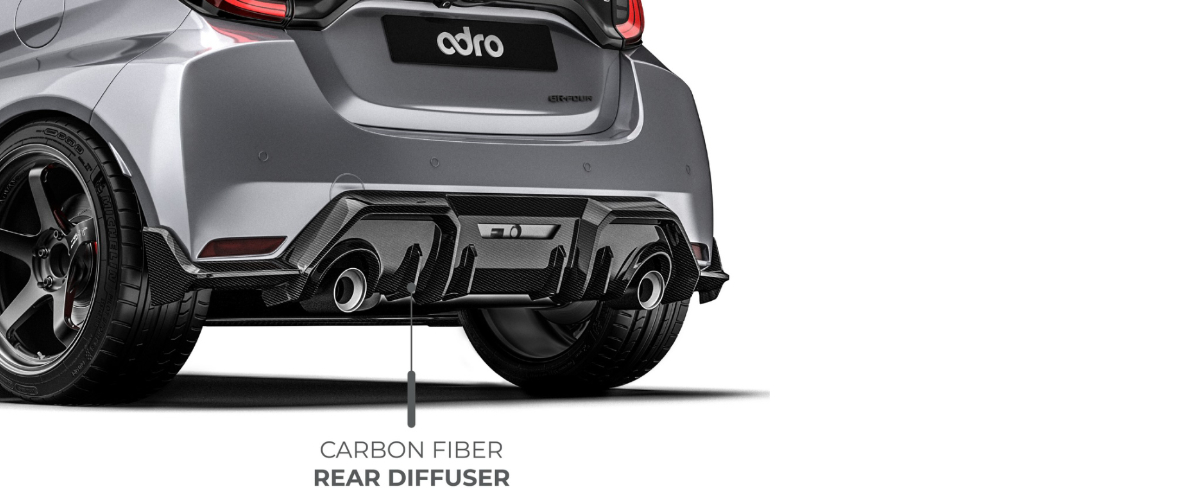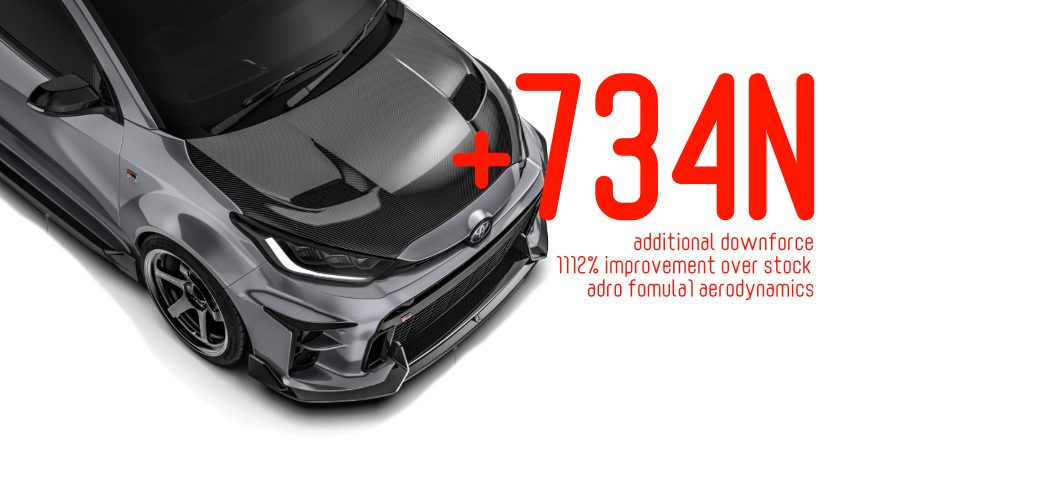 元F1空力博士の設計によるadro(エイドロ)社製、GRヤリスボディーパーツ。製品の企画立案から約4カ月の短期間で完成した待望のトヨタGRヤリス用adroボディーパーツがリリース開始!デザイン&クオリティーは勿論、スポイラーの性能であるエアロ効果もしっかり数値化された優れた製品です。adro-GRヤリスボディーパーツを実装する事で、プラス734n/mのダウンフォースが手に入ります。パーツ構成はカーボンフロントリップスポイラー/カーボンサイドステップ左右/カーボンリアディフューザー/カーボンリアウイング/ドライカーボンボンネットフードです。Gen2専用フロントリップ&リアディフューザーも順次リリース予定です。