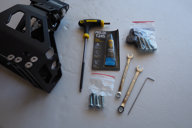 さて、話を製品に戻しまして、こちらが付属品一式!各種ツール(左右ストローク調整用のM2トルクスまで付属)と取り付けボルト+ねじ留め材です。あと弊社発行の取説兼保証書がセットされます。
