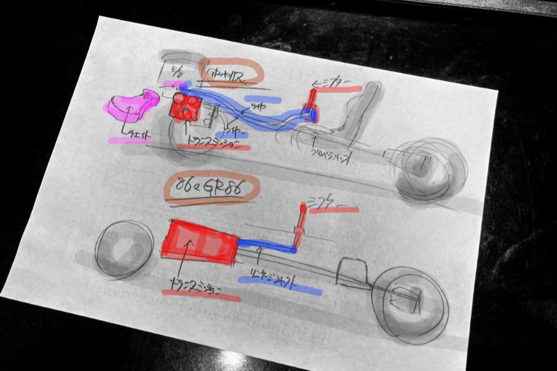 さて、ここで変速の仕組み&レイアウトを雑に解説!上画像の下側が86&GR86のシフトレイアウト。エンジンの後ろに連結されたトランスミッション(赤部分)の後方から延びたリンケージシャフト(青部分)と、IRPシフターが連結されます。シフト操作(前後左右)が一本のスチールシャフトを介して変速が実行されますので”ソリッド感”といいますが、よりスポーツカーらしいダイレクト感があります。一方、今回2年の歳月を経て無事製品化され”絶賛販売中”のGRヤリスのレイアウトが上部分。トランスミッションはエンジン左下後方に配置されています(赤部分)。そのトランスミッション上にリンケージが垂直に配置されリンケージ上部から2本のワイヤー(青部分)がシフターに接続されます。2本は前後操作と左右操作に分割されています。前後用ワイヤーはIRPシフター部分最下部に直結(ボール軸接続)、一方の左右制御ワイヤーはシフターベースの左側リンケージに接続されます(構造は純正と同じ)。で、FRの86&GR86との違いが操作デバイスが”スチールシャフトかワイヤーか”なんですね。詳しい方は「ワイヤー制御のシフトに質感を求めてもね、、諦」と言う声もあるかもしれませんが、自分が操作した限り全然大丈夫でした!もしかしたらFRの86より、ワイヤー制御のGRヤリス+IRPスポーツシフターの方が”ダイレクト感が強いかも”と。シフト操作時に握ったジュラルミンのシフトノブにシフト感覚が残るんですよ(変速する>ワイヤーが動く>縦リンケージが動く一連の感触)。これは元のGRヤリス開発陣営が創り上げた”スポーツカーらしいシフト操作感覚を更に研ぎ澄ました、、は、言い過ぎかもしれませんが、操作感が手に残る感覚はちょっと気持ち良いです。機械と、マシンとの一体感(マニア視点)が更に強くなった気がしました。もしかしたらですが上画像のシフトウエイト(紫部分-エアクリーナーケース下にあります)がバランス的にちょっと重くなったのかも?これは今後の検証とさせて頂きます。実製品は即納ございますので是非!
