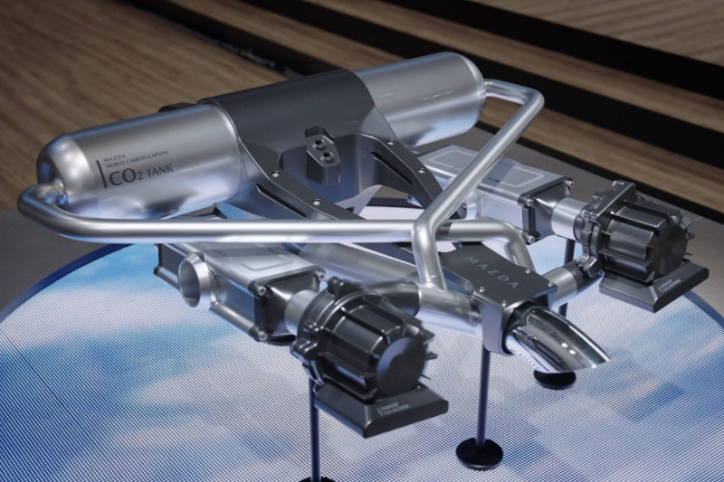 マツダのビジョンXクーペに搭載された二酸化炭素回収装置付きマフラー全景。2025ジャパンモビリティショウに展示されたらしく(見てないです)、カートップ誌でチラっと紹介されて個人的に気になってたメカニズム。で、超格好いいじゃないですか!なんかマフラーの新時代を感じる造形。性能はもちろんですが、仕立ての美しさも大事(それだけで興味が沸く)。ざっくりな仕組みは触媒を通った後の排気ガスをゼオライト/沸石由来のフィルターを介してCo2をタンクに回収(排気ガスに蒸気を通してゼオライト由来のフィルターにCO2を吸着させる>窒素成分のみ放出)。とりあえずカーボンキャプチャーユニット!と言う言葉を会話に織り交ぜれば”合コン成功”間違いない、、かもしれない。 日々精進