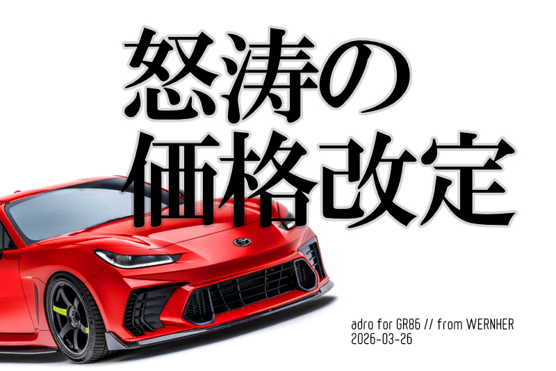 adro(エイドロ)のGR86パーツ価格改定が確定致しましたので受注再開致します。弊社ヴェルナーWEB製品ページ&WEBショップの表示価格も改定済みです。で、、、BRZ2Gen用カーボンリップスポイラーを除いてGR86用パーツは全て値下げでした(汗)。本気で日本市場を狙った”ドンズバプライス(想定適正価格)”!待ってました!なGR86オーナーの皆様っ!今です!今すぐに予約注文しましょう!「AT-R1スワンネックウイング欲しかったけどどーしよー」と悩んでいた方っ!14万円の値下げ(事実です、、汗)なら買いますよね?その余剰資金でadroパーツの購入追加もありかと思います。念のために新旧価格を下記に掲載しました。何卒宜しくお願い致します。 日々精進